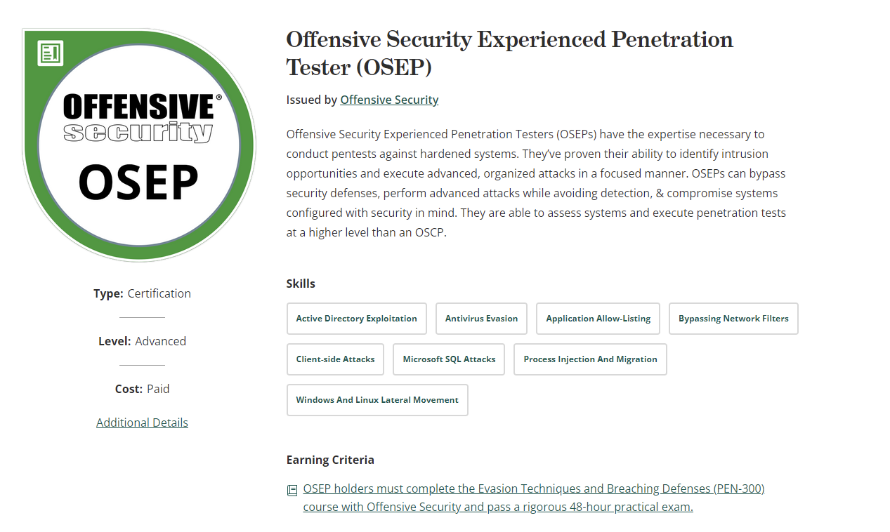 OSEP เป็น course ตระกูล 30x หรือ expert level ของค่าย Offensive Security ซึ่งการได้ certificate ตัวนี้มาจะต้องผ่านการเรียน course PEN-300: Evasion Techniques and Breaching Defenses และผ่านการเข้าสอบในลักษณะ hands-on examination ได้ตามเกณฑ์ที่ทาง Offensive Security เจ้าของค่ายกำหนด โดยทางเจ้าของค่ายเองไม่ได้กำหนดเป็น pre-requisite ว่าเราต้องผ่าน OSCP (PEN-200) ก่อนแต่อย่างใด แต่ในมุมของผมเองแล้ว หลายๆ อย่างใน course นี้ “จำเป็นต้องใช้” หลายๆ methodology จาก OSCP เลยคิดว่าถ้าผ่านมาก่อนจะเป็นอะไรที่ดีมากครับ